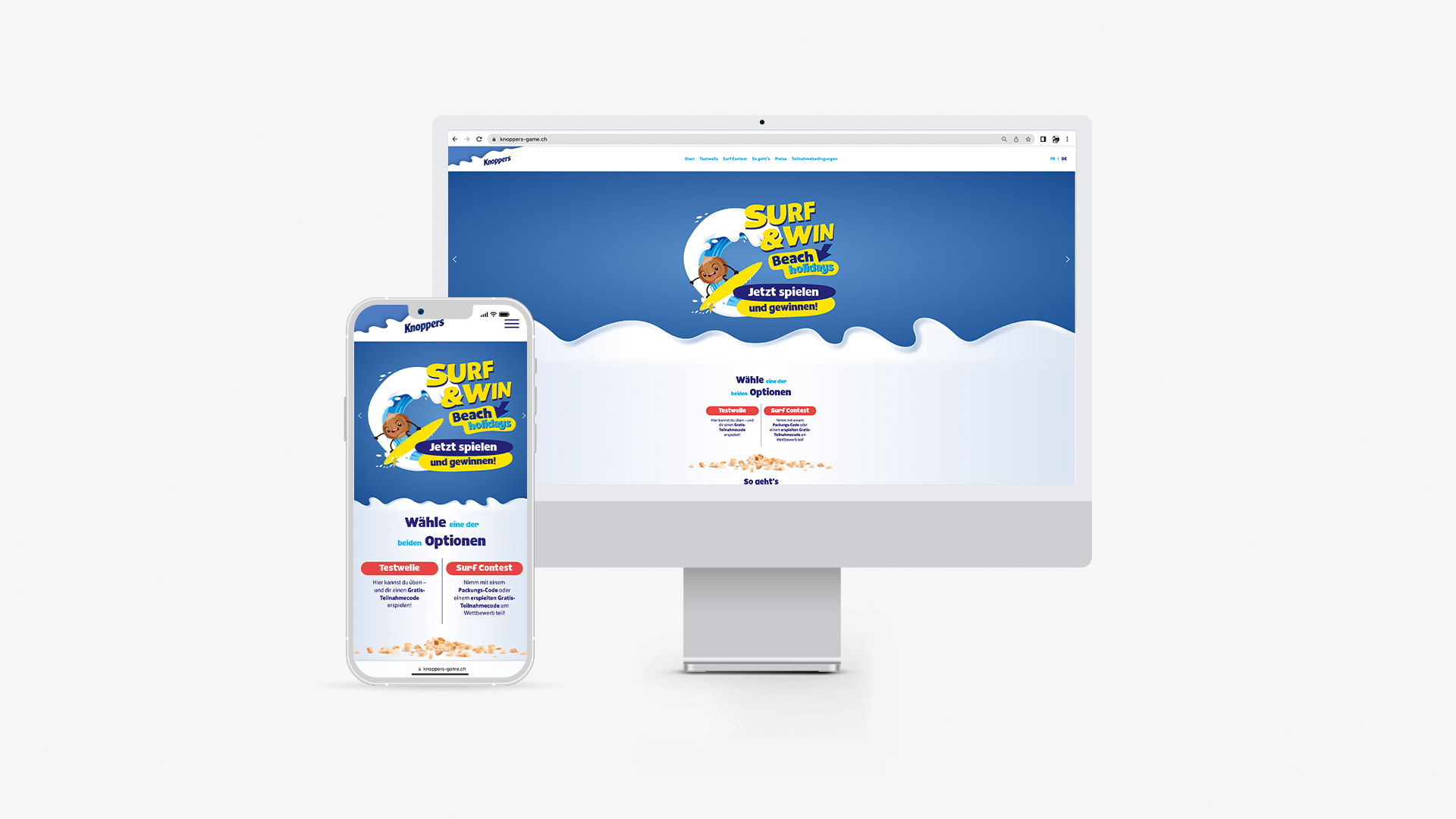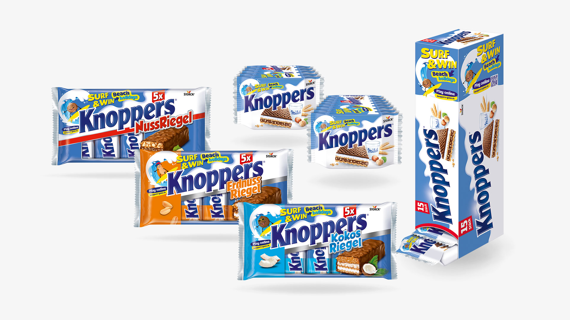 Bei der diesjährigen POS-Promotion «Knoppers SURF & WIN» werden verschiedene Altersgruppen abgeholt und mit einem spassigen Game in die Welt von Knoppers geführt. Zu gewinnen gibt es wöchentlich drei Preise rund ums Thema «Surfen». Als Hauptpreis wird ein Ferien-Gutschein unseres Partners, Hotelplan, verlost.