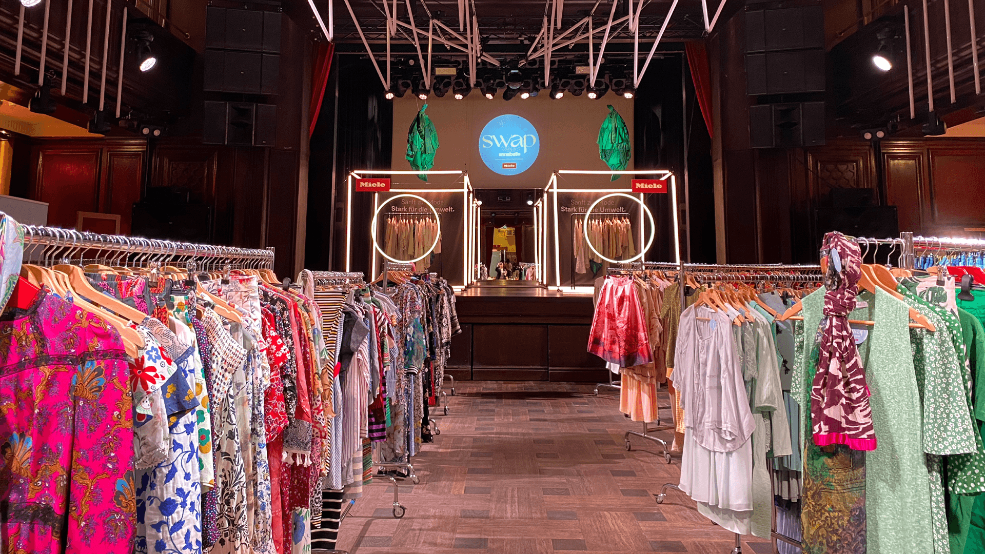 Um Miele und die Wäschepflege-Kampagne auf dem SWAP-Event optimal zu präsentieren, haben wir eine innovative Konzeptidee entwickelt und umgesetzt. Das Highlight war der Stand auf der Bühne des Kaufleuten, der mit leuchtenden Cubes gestaltet wurde, die an Miele-Waschmaschinen erinnerten. Diese Cubes dienten als Präsentationsfläche für Kleidungsstücke, die zum Tausch angeboten wurden, und schufen eine direkte Interaktion mit den Besucher*innen. Zusätzlich wurde das Keyvisual im Raum in Form von hängenden Kleidern in 3D ausgearbeitet und über den Cubes angebracht. Dies verstärkte den visuellen Eindruck und die Brand Awareness von Miele.